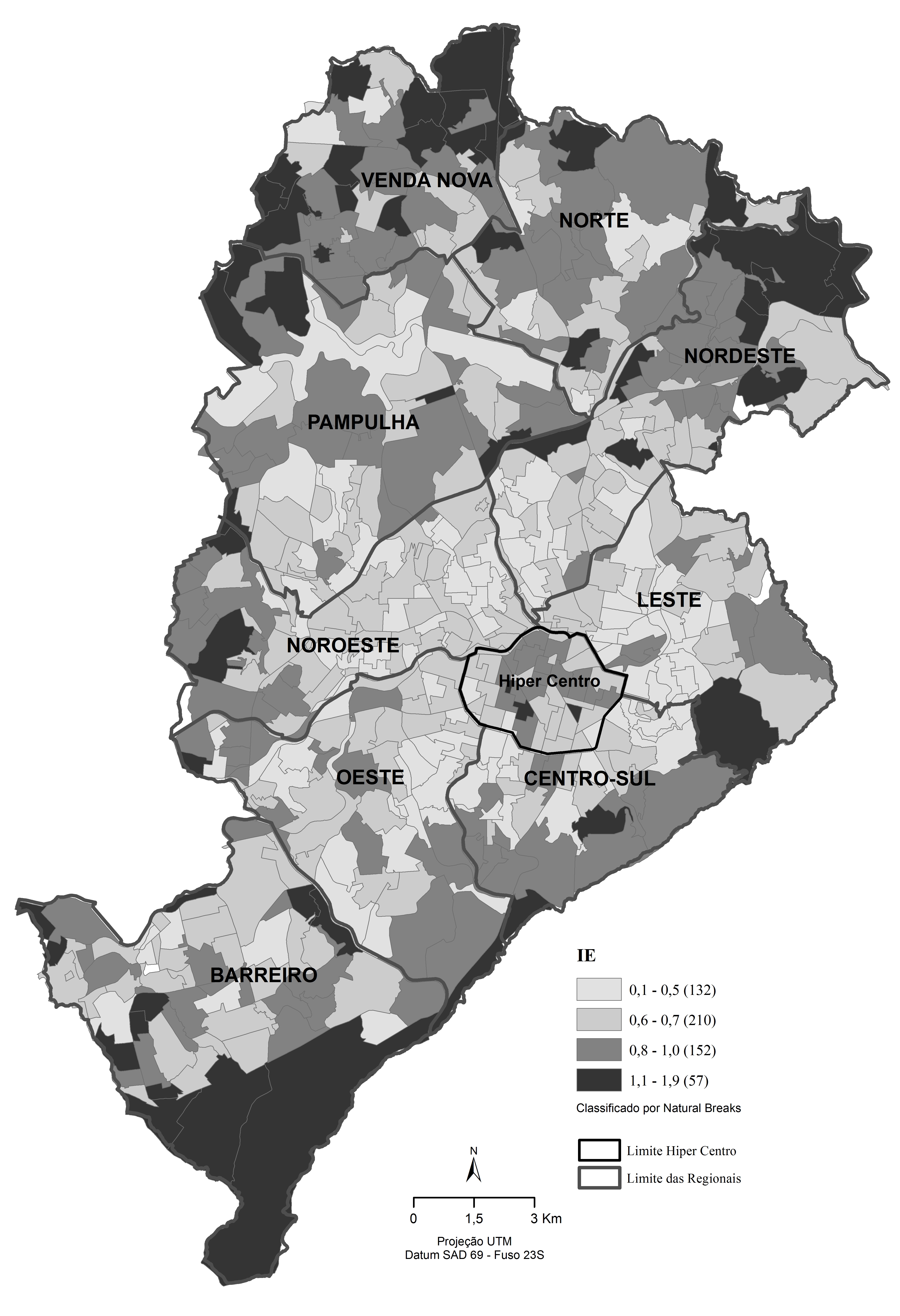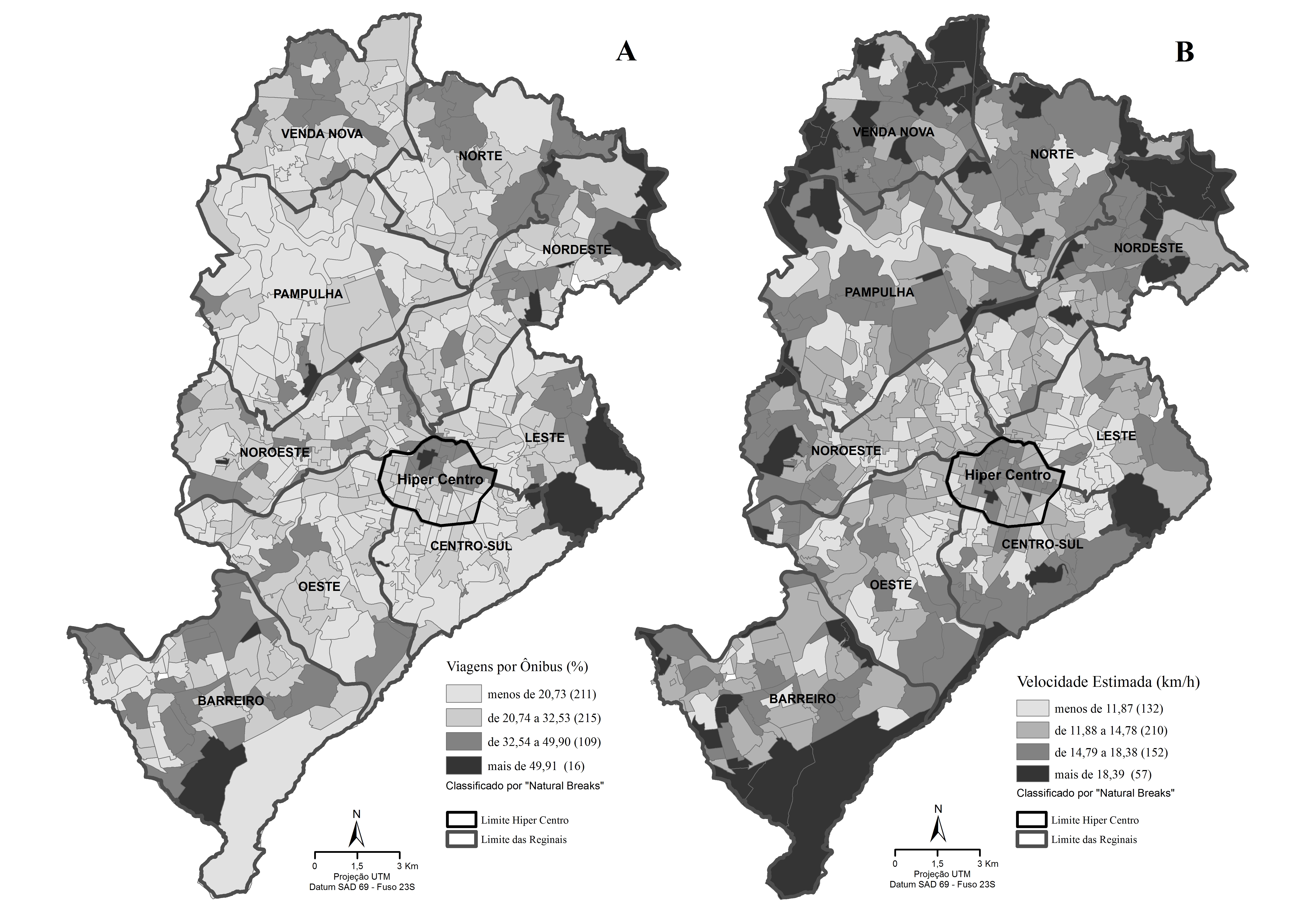 In accordance with data from the 2012 Household Origin Destination Survey for the Metropolitan Region of Belo Horizonte (MRBH), this article seeks to evaluate the efficiency of the public transportation displacements by bus in Belo Horizonte, based on the proposal and analysis of the Public Transport Efficiency index (PTEI). This is an indicator that assesses the efficiency of transport, based on the parameters of distance, time and speed of the journeys made. The results indicate that in the central area and the pericentral municipal regions there are lower average speeds of destination flows. These areas have a large concentration of trade and services activities. In the spatial units located in the extreme north and south of Belo Horizonte, probably due to the presence of the main road corridors, two of them with exclusive bus lanes in the period when the OD Survey was conducted, the findings indicated journeys that involve not only distances, but also slightly higher speeds compared to other regions of the city. These vectors also exhibited a greater share of the bus mode, probably as they cover the poorest population strata of the city, which are more dependent on public transport in relation to the more affluent groups. The results and the proposed analytical methodology of this study represent a contribution to the proposition, debate and the planning and management of space, including the development of urban mobility policies.