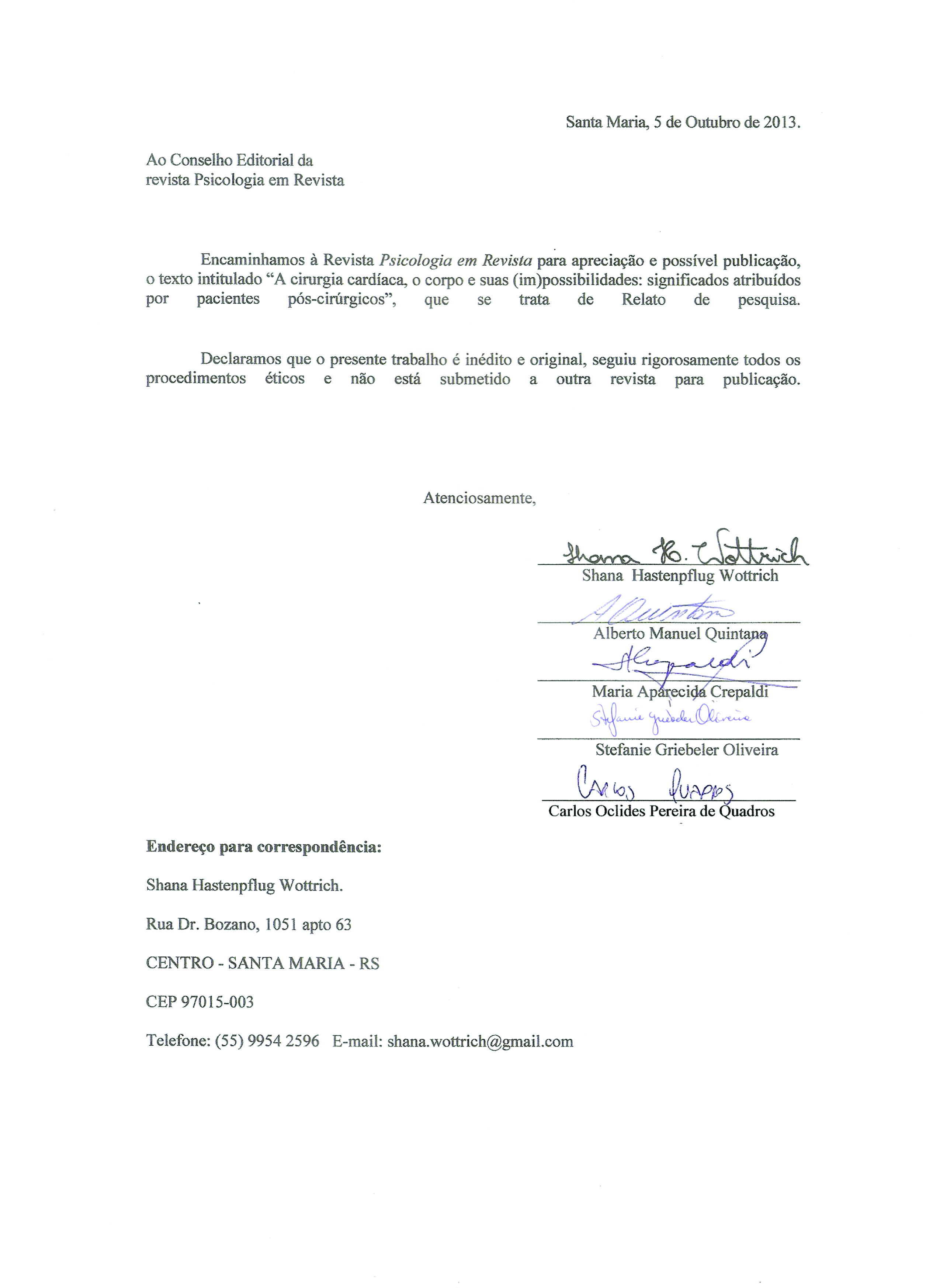 Encaminhamos à Revista Psicologia em Revista para apreciação e possível publicação, o texto intitulado XXXXXX.